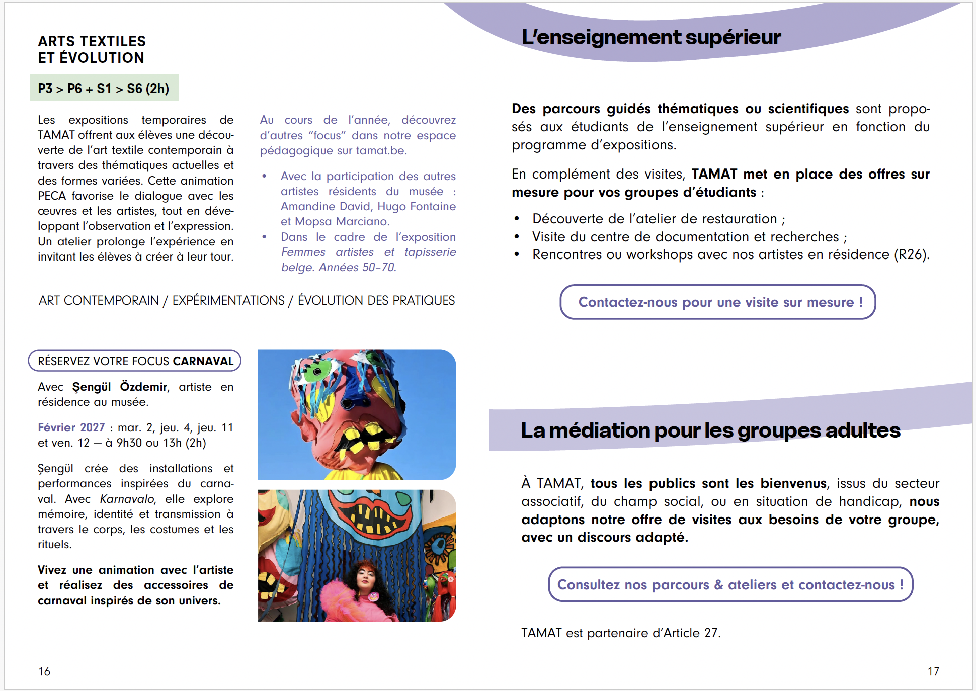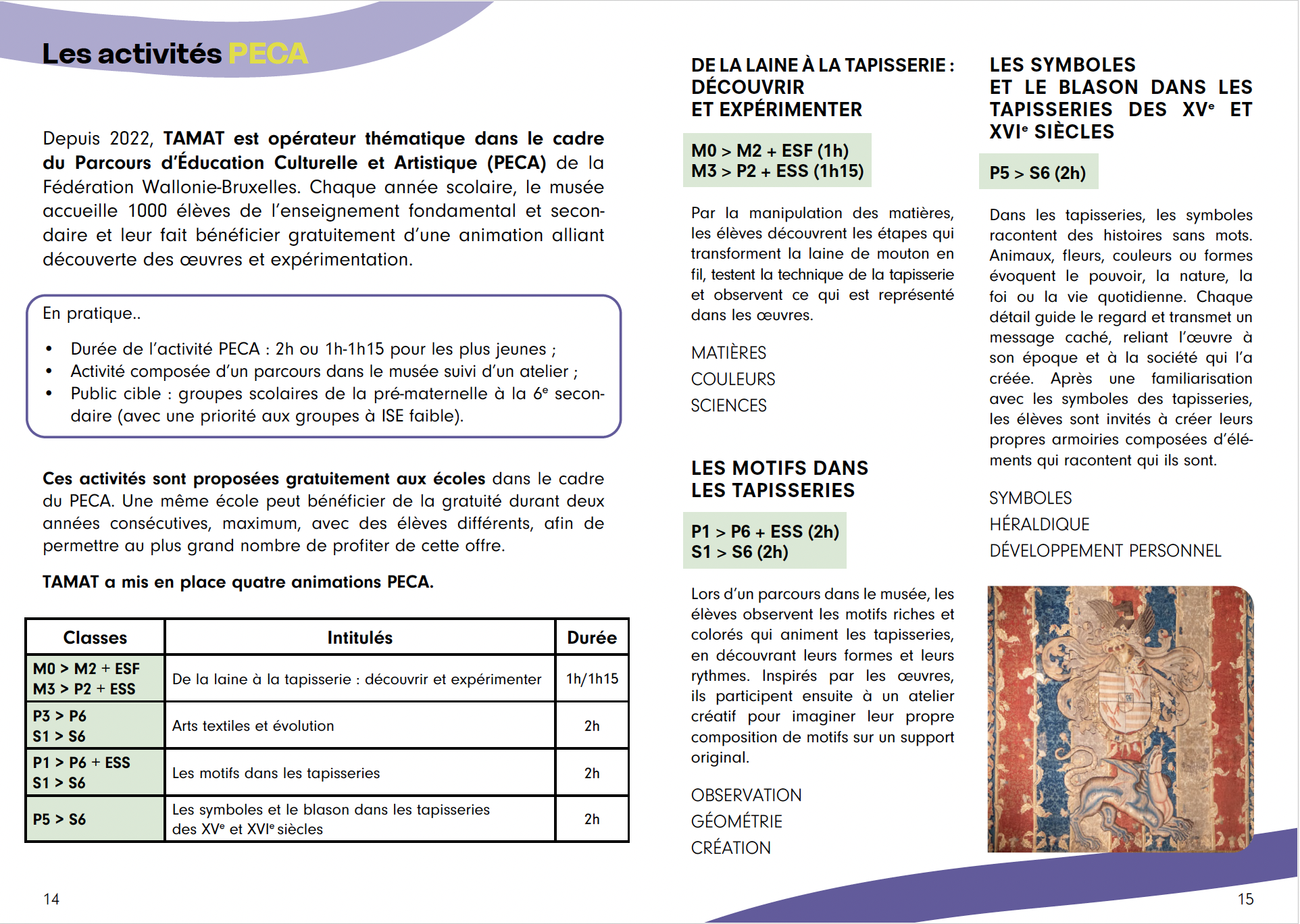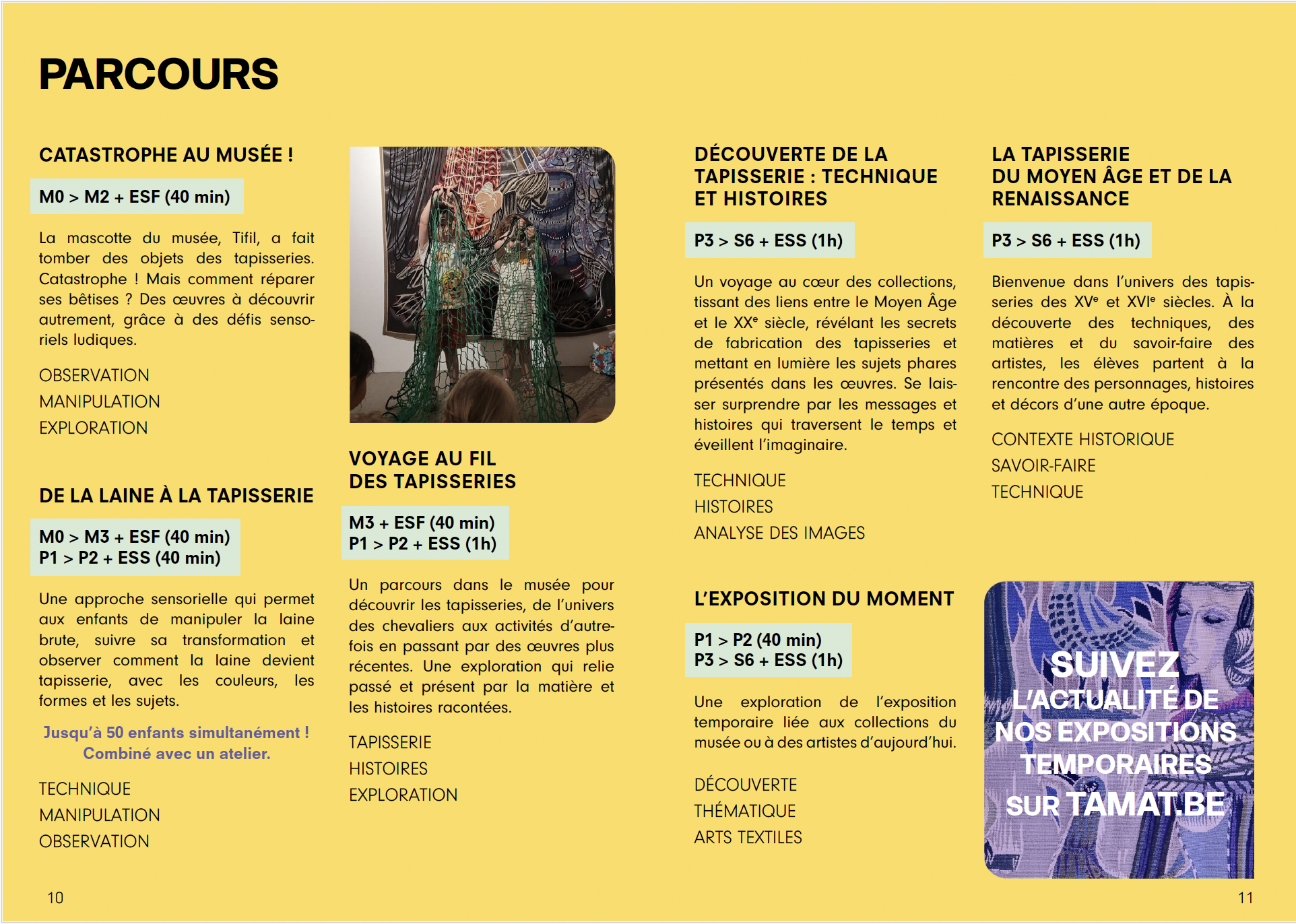 De septembre à juin, l’équipe de TAMAT propose aux classes maternelles, primaires et secondaires une série d’activités : visites animées des collections du musée ou des expositions temporaires, ateliers, rencontres avec des artistes, visite de l’atelier de restauration, etc.