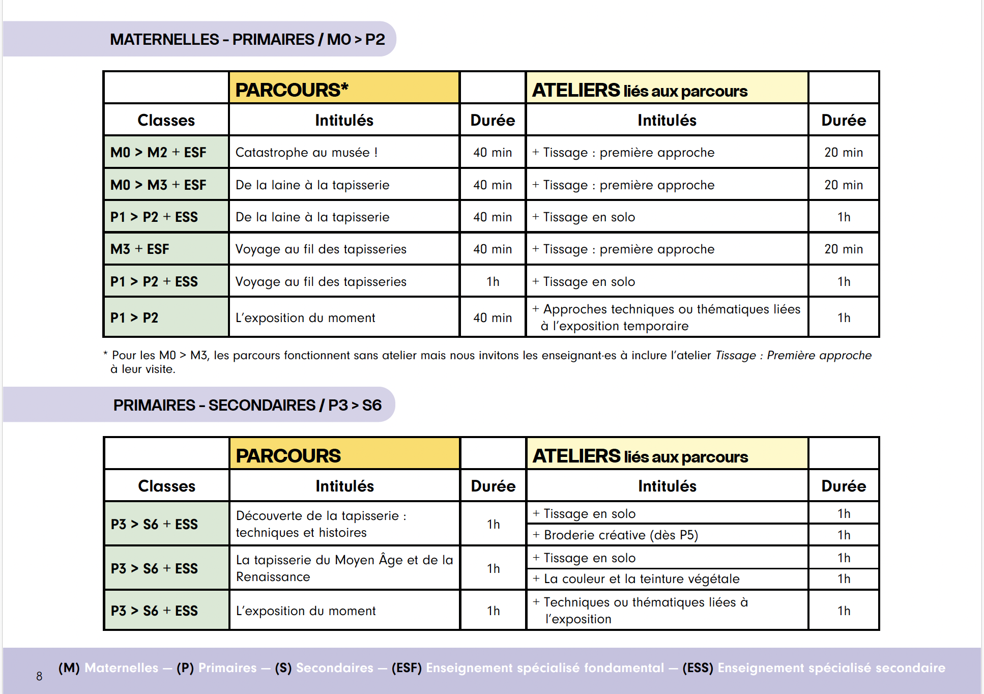 (M) Maternelles – (P) Primaires – (S) Secondaires – (ESF) Enseignement spécialisé fondamental – (ESS) Enseignement spécialisé secondaire